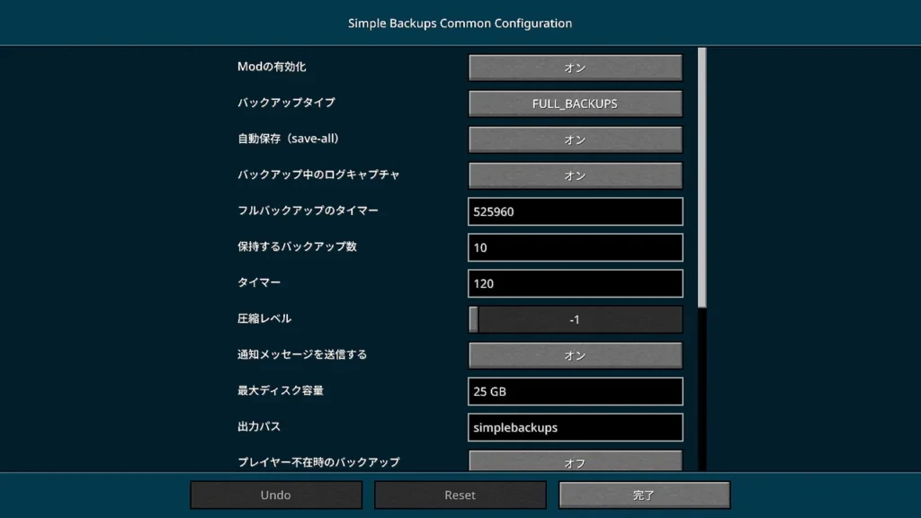 Minecraftのバックアップ自動化Mod「Simple Backups」の設定項目について、整理しました。