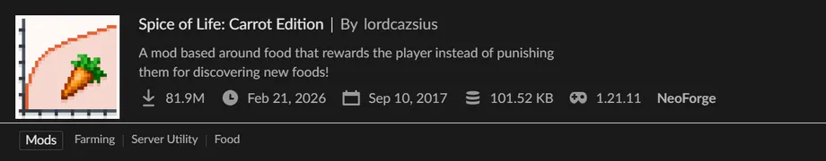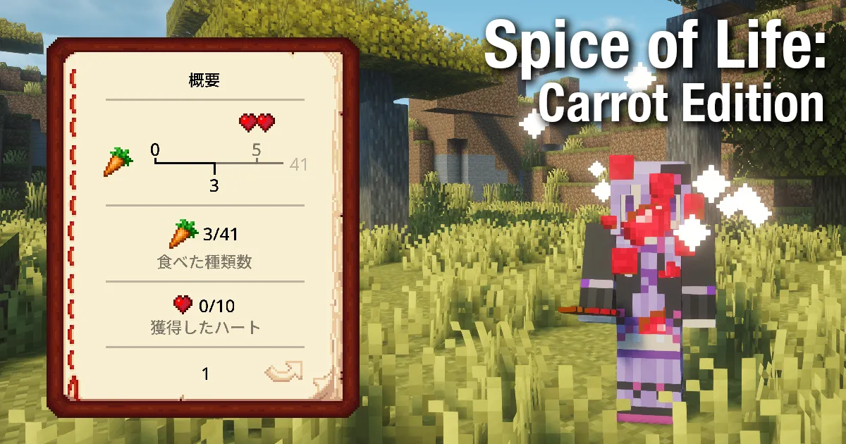 多様な食事を怠ったことへの「罰」を与えるのではなく、さまざまな種類の食べ物を食べたことへの「報酬」を与えるの『Spice of Life: Carrot Edition』の紹介と日本語化リソースパックを配布しています。