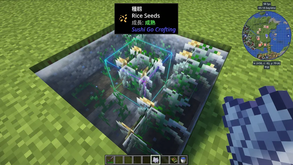 耕地の上1ブロック分に水を張って、そこに種籾を植え付けてください。ほかの作物と同じく骨粉で成長促進可能です。
