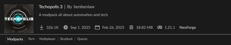 テクノロジーと自動化をテーマにしたModパック『Techopolis 3』の紹介とクエスト日本語化ファイルを配布しています。