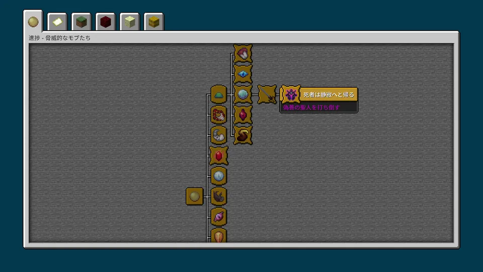 ゲームを開始すると、「The Threateningly Mobs」という最初の進捗がアンロックされます。そこから、特定のモブを倒したり、アイテムを入手したりすることで、ツリー状に新たな進捗が解放されていきます。どのボスに挑戦すべきか迷ったときは、この進捗タブを開いて次の目標を確認してみましょう。